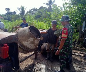 OKU – Guna terciptanya sinergitas TNI bersama rakyat, Babinsa Koramil 403-07/Simpang Kodim 0403/OKU, Serda Fikri melaksanakan karya bakti membantu pengecoran jalan setapak
