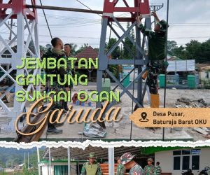 OKU – Prajurit TNI dari wilayah Kodim 0403/OKU terus mempercepat pembangunan Jembatan Gantung yang berlokasi di aliran Sungai ogan di Desa Pusar,