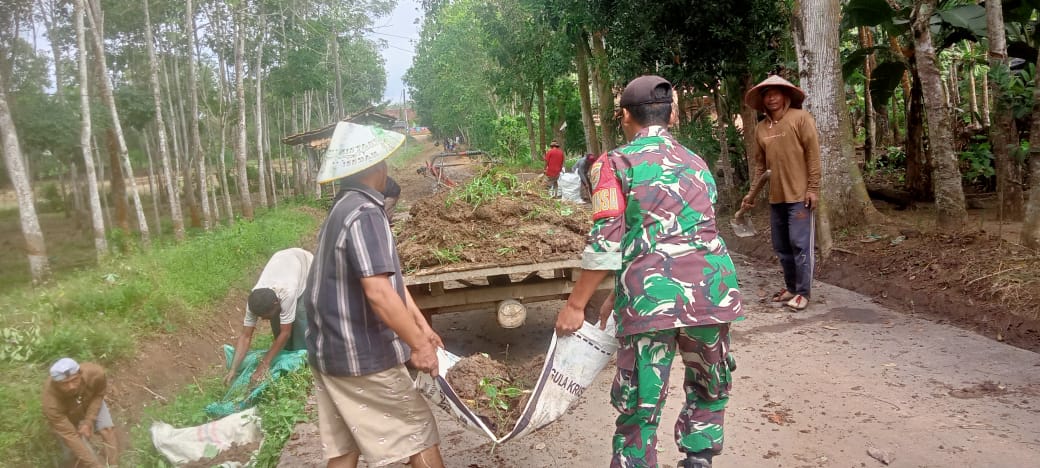 Kodim OKU – Babinsa bersama warga masyarakat bersinergi melaksanakan gotong royong merapihkan jalan menuju persawahan, di Desa Trimoharjo, Kecamatan SS III, Kabupaten OKU Timur, Selasa (10/01/2023)