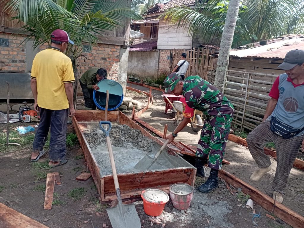 OKU – Babinsa Koramil 01/Pengandonan Serda Edi Hartono melaksanakan kerja bakti pengecoran jalan setapak di Desa Surau, Kecamatan Muara Jaya, Kabupaten OKU, Rabu (03/07/2024)