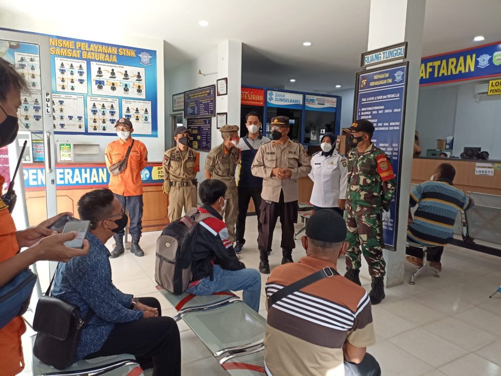 Kali ini Babinsa Koramil 13/Lubuk Batang, Kodim 0403/OKU bersama sama tiga pilar melakukan patroli PPKM Mikro di Kantor Samsat jalan Mayor Ismail Husein Kemala Raja, Kecamatan Baturaja Timur, Kabupaten OKU, Senin (30/05/2022)