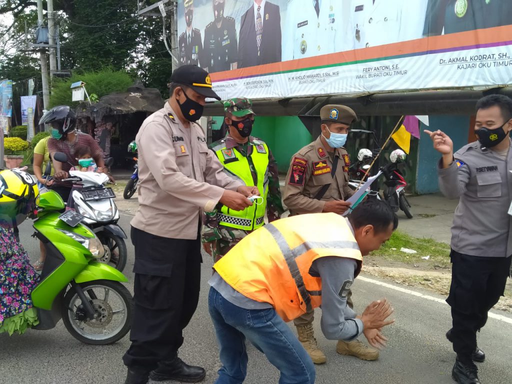 Kodim OKU – Babinsa Koramil 403-03/Martapura Kodom 0403/OKU Sertu Agung bergabung dengan Forkopimda melaksanakan operasi Yustisi pendisiplinan protokol kesehatan Masyarakat di sekitar tugu tani Kec. Martapura Kab. OKU Timur, Sabtu(23/01/21).