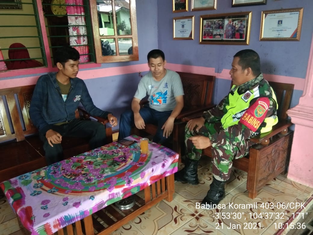 Kodim OKU – Menjalin keakraban dan kekompakan dengan warga binaan merupakan salah satu tugas pokok Babinsa. Seperti yang dilakukan oleh anggota Koramil 403-06/Cempaka Kodim 0403/OKU Peltu Suratno Babinsa Desa Betung Kec. Semendaway Barat Kab. OKU Timur, melaksanakan komunikasi sosial (Komsos) dengan warga binaan, Kamis (21/01/21).