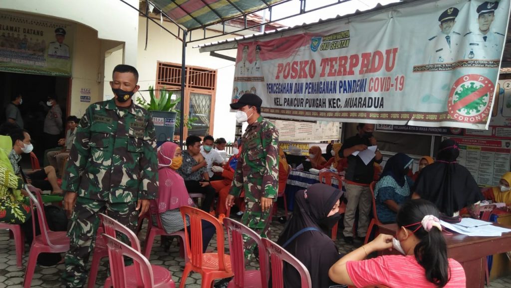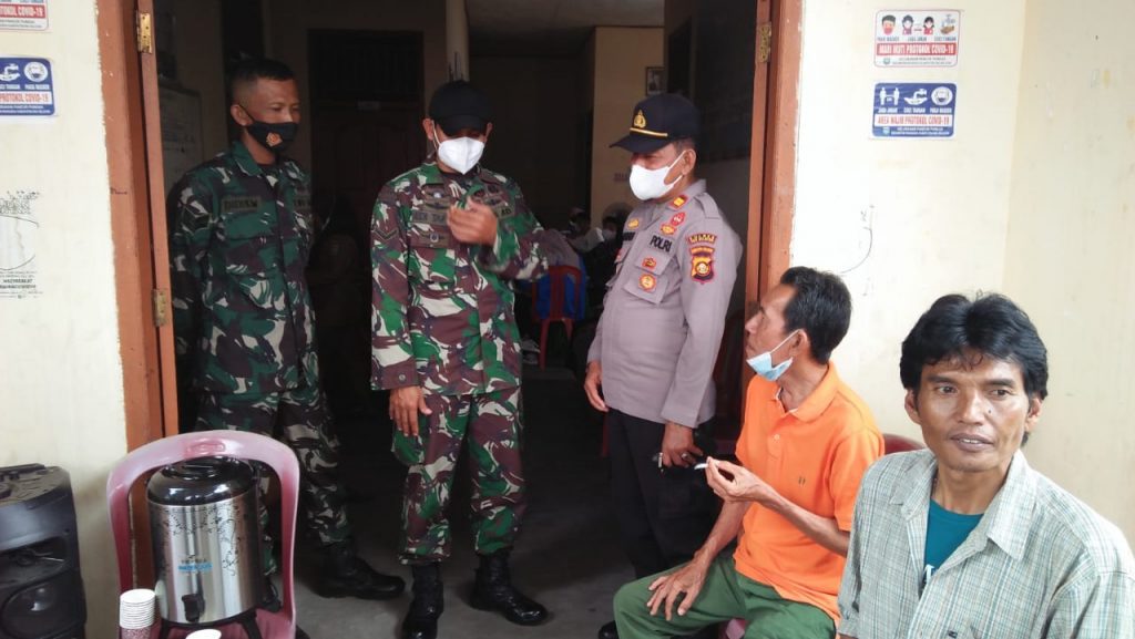 Kodim OKU – Anggota Koramil 403-08/Muardua melaksanakan monitoring dan pengamanan pelaksanaan Vaksinasi Covid-19 tahap 1 dan 2 yang dilaksanakan di Aula Kantor Lurah Pancur Pungah, Kecamatan Muardua, Kabupaten OKU Selatan, Kamis (11/11/2021)