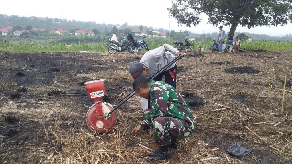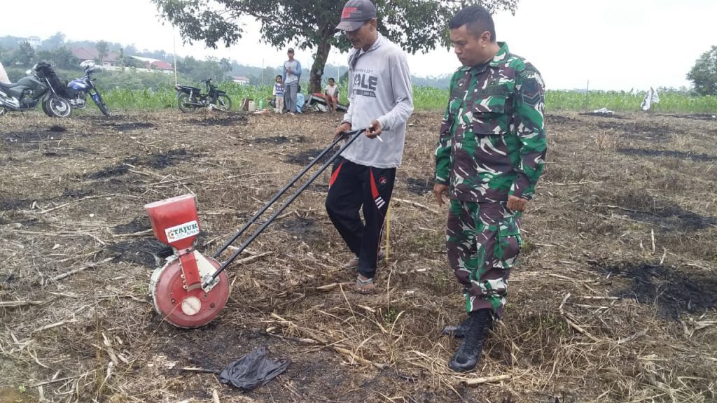 Babinsa Koramil 403-09/Muaradua Kisam Sertu Salahuddin Ali melaksanakan pendampingan kepada kelompok tani dalam menanam Jagung di desa Binaannya