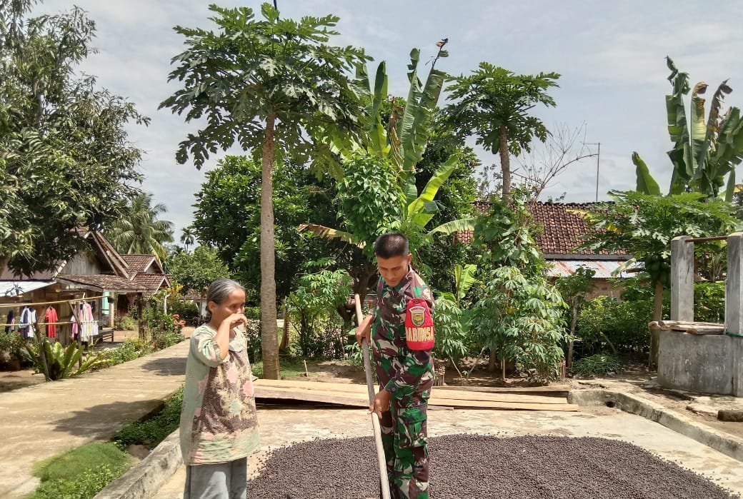 OKU – Babinsa Koramil 09/MDK, Kodim 0403/OKU Serka Mukhlisin membantu salah satu warganya di Desa Dusun Tengah, Kecamatan Muaradua Kisam, Kabupaten OKU Selatan, menjemur biji kopi.