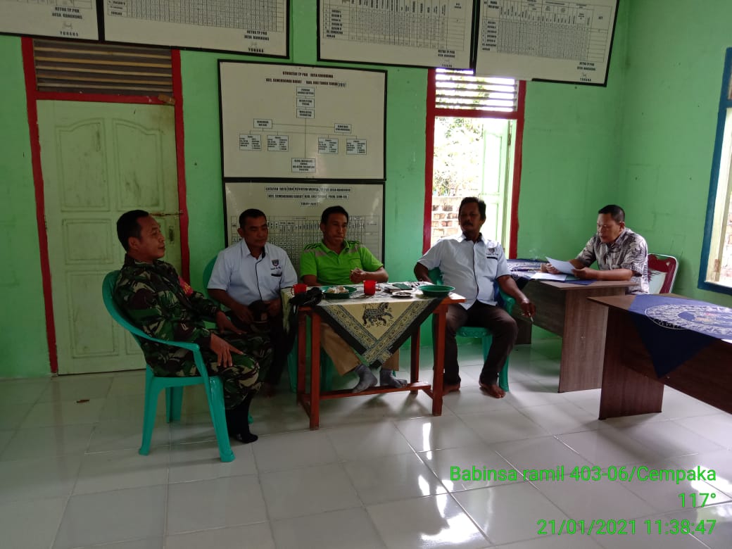 Kodim OKU – Dalam rangka meningkatkan sinergitas di wilayah binaanya, personil Bintara Pembina Desa (Babinsa) Koramil 403-06/Cempaka Kodim 0403/OKU Sertu Sriyono terus aktif melaksanakan Komunikasi Sosial (Komsos) bersama seluruh elemen masyarakat, seperti pada Komsosnya bersama aparat Desa Kangkung Kecamatan Semendawai Barat Kabupaten OKU TIMUR, Kamis (21/01/21).