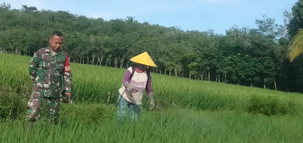 OKU – Untuk mengusir adanya hama wereng yang ada pada tanaman padi milik warga Desa Karang Agung Talang Tengah Dusun VII, Kecamatan Simpang Kabupaten OKU Selatan serta untuk menghalau datangnya hama wereng Satgas TMMD ke-124 Kodim 0403/OKU bersama petani pemilik lahan yang terdapat serangan hama wereng melakukan penyemprotan dengan pestisida di tanaman padi tersebut, Rabu (28/05/2025)