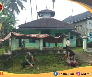 OKU Selatan — Babinsa Koramil 403-09/Muara Dua Kisam Kodim 0403/OKU Serda Niki bersama warga melaksanakan gotong-royong membersihkan lingkungan disekitar Musolah At-Taqwa di
