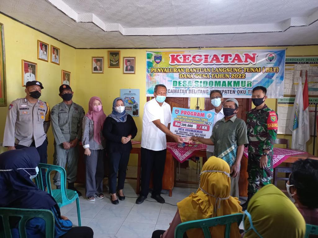Kodim OKU – Babinsa Koramil 04/Belitang Kodim 0403/OKU Serma Hari Anggara melaksanakan Pendampingan penyaluran Bantuan Langsung Tunai Dana Desa (BLT-DD) Tahun 2022, dilaksanakan di Kantor Desa Sidomakmur Kecamatan Belitang, Kabupaten OKU Timur, Sabtu (09/04/2022).