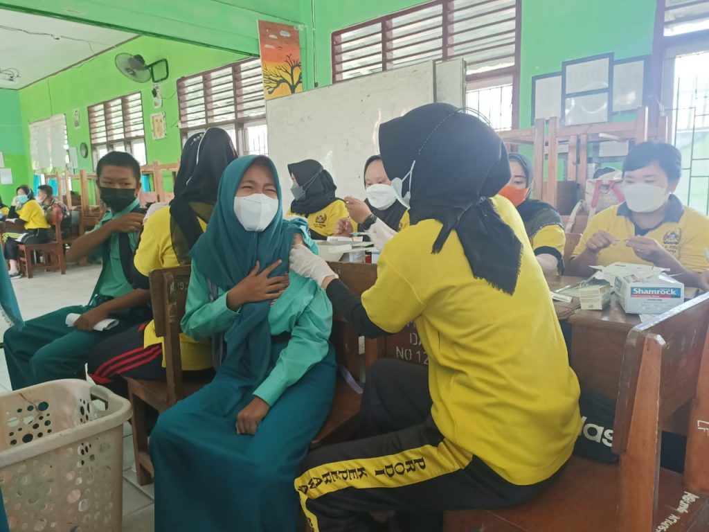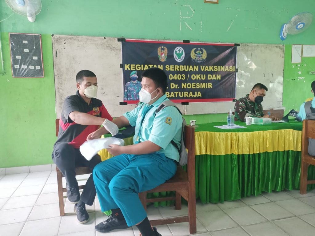 Kodim OKU – Dandim 0403/OKU Letkol Arh Tan Kurniawan. S.A.P, M.I.Pol meninjau Vaksinasi Dosis Kedua bagi Siswa SMA Negeri 1 OKU, Jelang Pembelajaran Tatap Muka Terbatas Untuk memenuhi salah satu syarat PTM (Pembelajaran Tatap Muka) dapat diselenggarakan, pada hari Kamis, 07/10/2021 sejumlah 390 siswa SMA N 1 OKU mengikuti kegiatan vaksinasi Covid-19 dosis 2 di ruang belajar SMA Negeri 1 Kegiatan vaksinasi terwujud atas kerja sama antara Kodim 0403/OKU dengan Rumkit TK. IV 02.07.05 dr. Noesmir Baturaja dan pihak sekolah sehingga kegiatan ini dapat terlaksana dengan teratur dan tetap mematuhi protokol kesehatan.