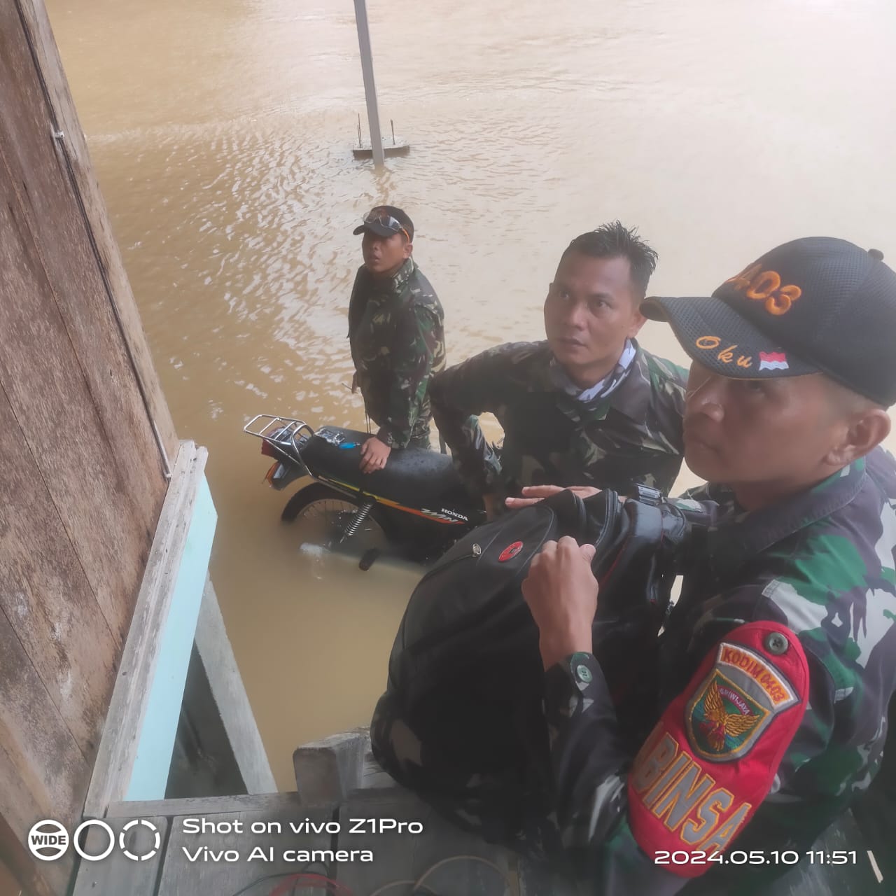 OKU – Danramil 403-02/Peninjauan Kapten Inf Airul dan Babinsa terjun langsung mengevakuasi warga akibat Banjir di Desa Kedaton Kecamatan Kedaton Peninjauan Raya, Kabupaten OKU, Jum’at (10/05/2024).