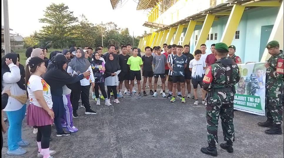OKU – Babinsa Koramil 403-12/Baturaja Kodim 0403/OKU Peltu Edrizal, memberikan sosialisasi terkait penerimaan calon prajurit TNI Angkatan Darat (AD) kepada warga Baturaja yang sedang berolah raga di taman kota Baturaja, Kabupaten OKU, Selasa (20/05/2025) Sore