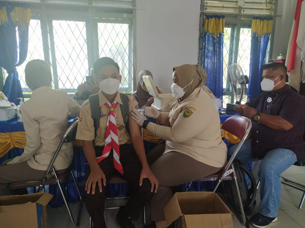 Kodim OKU – Pelaksanaan serbuan vaksinasi Covid -19 yang digelar Kodim 0403/OKU bersama Rumkit TK. IV 02.07.05 dr. Noesmir Baturaja menyasar siswa di Sekolah sekolah, salah satunya SMAN 5 OKU yang berada di Kecamatan Baturaja Timur Kabupaten OKU, Rabu (06/10/2021)