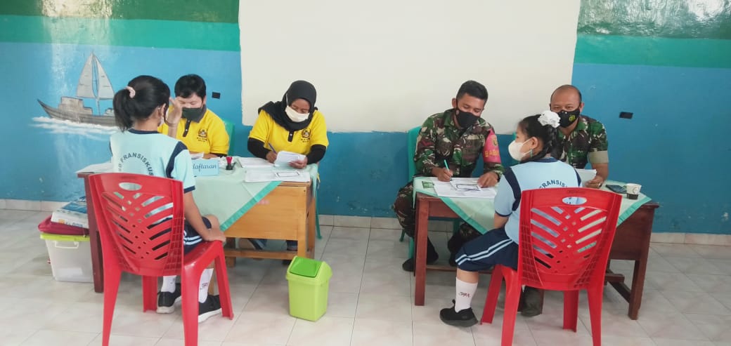 Kodim OKU – Mendukung percepatan vaksinasi Covid-19 untuk anak usia 6-11 Tahun yang dicanangkan pemerintah, Kodim 0403/OKU merespon dengan program Serbuan Vaksinasi dengan cara jemput bola bertempat di SD Fransiskus Baturaja jalan Komisaris Umar No 30 Air Gading Kecamatan Baturaja Barat, Kabupaten OKU, Kamis (17/02/2022)