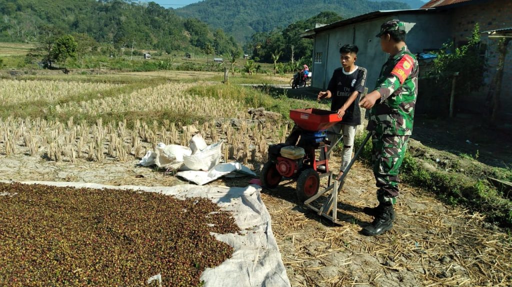OKU – Anggota Babinsa Koramil 11/Pulau Beringin Koptu Rico membantu Warga Menggiling Kopi, di Desa Muara Sindang Ilir, Kecamatan Sindang Danau, Kabupaten OKU Selatan, Kamis (13/02/2025)