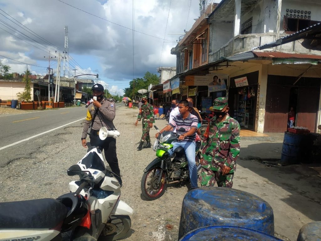 OKU – Rutinitas kegiatan Babinsa Koramil 07/Simpang, Kodim 0403/OKU Serda Afanisman melaksanakan penegakan disiplin protokol kesehatan di wilayah Kecamatan Lengkiti, Kabupaten OKU, Senin (18/04/2022)