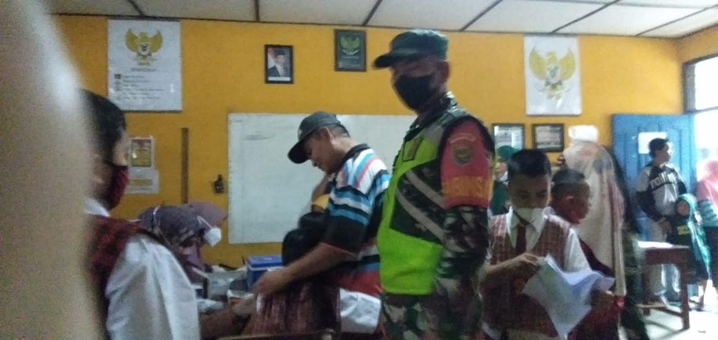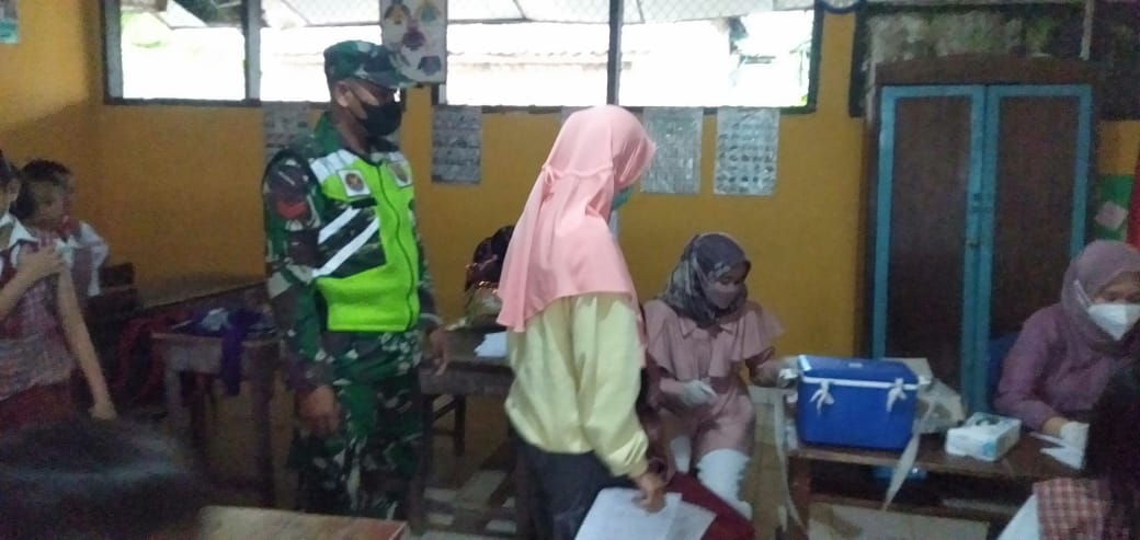 Kodim OKU – Babinsa Koramil 06/Cempaka Koptu Tukul Haryanto monitoring vaksinasi anak umur 6-11 tahun di SDN 01 Camping dan SDN 02 Campang Tiga Ilir Kecamatan Cempaka, Kabupaten OKU Timur.