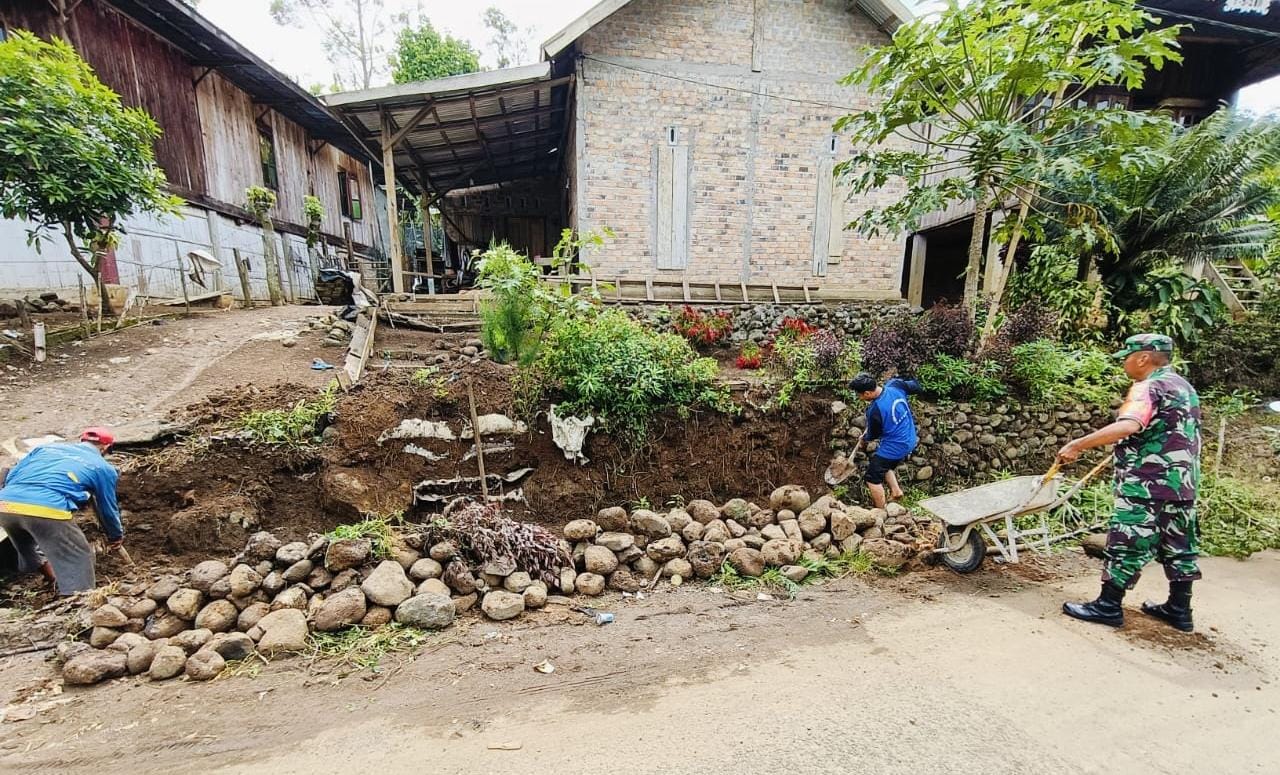 OKU Selatan, BERITAS3.com – Babinsa Koramil 403-09/Muara Dua Kisam Kodim 0403/OKU Serka Salahuddin, gotong royong bersama warga masyarakat memperbaiki parit jalan yang sudah rusak akibat longsor terkikis air hujan di lingkungan warga Desa Siring Alam, Kecamatan Kisam Ilir, Kabupaten OKU Selatan, Selasa (25/11/2025).