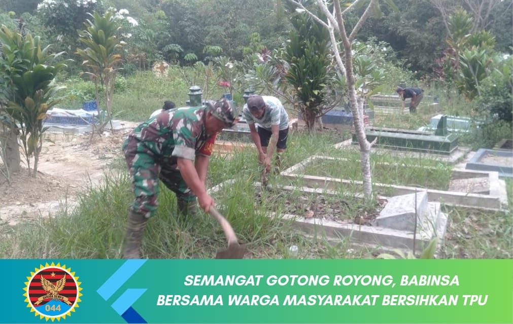 OKU – Personel Babinsa Koramil 403-02/Peninjauan, Serma Marwanto bersama warga masyarakat melaksanakan gotong royong di Tempat Pemakaman Umum (TPU) di Desa Karya Mukti, Kecamatan Sinar Peninjauan Kabupaten OKU, Senin (6/10/2025).