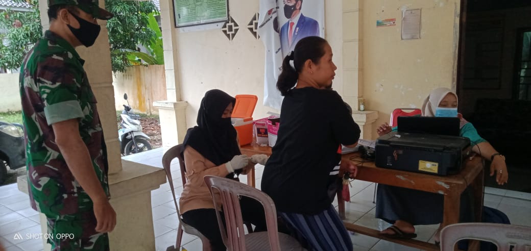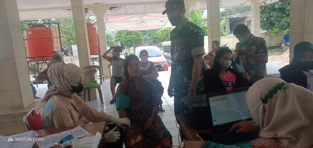 Kodim OKU – Serda Sigit Babinsa Koramil 03/Martapura Kodim 0403/OKU melakukan monitoring pemberian vaksinasi Sinovac tahap II untuk warga BP. Peliung Kegiatan vaksin tahap II di gelar di UPTD Puskesmas Desa Banu Ayu, Kecamatan BP. peliung, Kabupaten OKU Timur, Sabtu (26/03/2022).