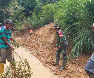 BERITAS3.com, OKU Selatan – Semangat gotong royong, Babinsa Koramil 403-11/Pulau Beringin Serda M. Mujahidin, bersama masyarakat melaksanakan gotong royong membersihkan material longsor