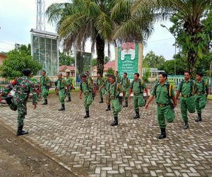 Kodim OKU – Bertempat di halaman Balai Desa Karya Mukti Babinsa Koramil 02/Peninjauan Praka Robi Jailani memberikan materi Baris – berbaris kepada