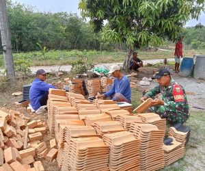 OKU – Babinsa Koramil 05/Buay Madang Sapudi Serma Anang Sriyatno menggelorakan semangat gotong royong dengan membantu warga cat genteng di Desa Harjo