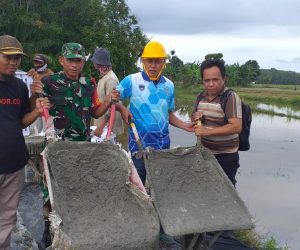 Kodim OKU – Babinsa Koramil 05/Buay Madang, Kodim 0403/OKU Serda Cecep bersama warga Kota Negara bergotong royong melaksanakan karya bakti pengecoran jalan