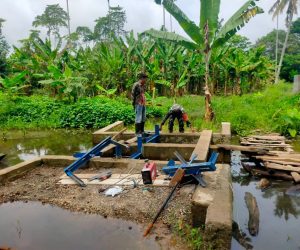 OKU – Babinsa Koramil 06/Cempaka Serda Suwarno bersama masyarakat melaksanakan gotong royong pembangunan jembatan darurat di Desa Ulak Baru, Kecamatan Cempaka, Kabupaten,