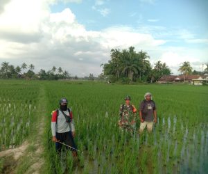 OKU – Dalam rangka mengantisipasi serangan hama atau penyakit yang dapat merusak tanaman padi, Babinsa Koramil 403-03/Martapura, Kodim 0403/OKU melakukan pendampingan penyemprotan