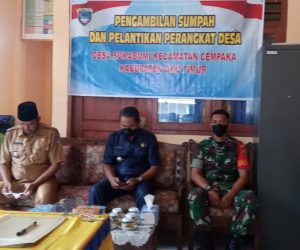 Kodim OKU – Babinsa Koramil 403-06/Cempaka Kodim 0403/OKU Serda Aries N menghadiri acara pengambilan sumpah jabatan dan pelantikan Kadus di Balai Desa