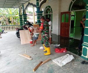 Kodim OKU – Babinsa Koramil 403-06/Cempaka Serda Dwi Budiono bersama masyarakat melaksanakan kegiatan karya bhakti pembenahan Masjid Nurul’ Alam di Desa Gunung