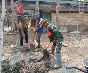 OKU – Bintara Pembina Desa (Babinsa) Koramil 06/Cempaka jajaran Kodim 0403/OKU Sertu Ngadino membantu warga binaan mengaduk campuran semen dan pasir di