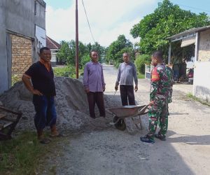 OKU – Bantu ringankan pekerjaan warga Babinsa Koramil 403-06/Cempaka, Praka Priyo Wicaksono bantu mengangkat pasir untuk pembangunan rumah tempat tinggal bapak Samran