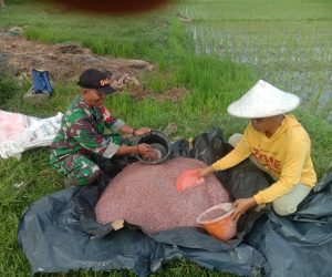 OKU – Babinsa Koramil 09/Muaradua Kisam Kodim 0403/OKU Sertu Zainal membantu pemupukan tanaman padi milik salah satu petani di Desa Bandar Alam