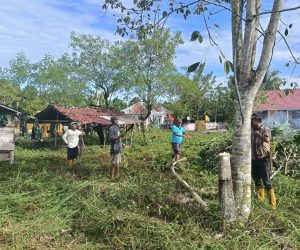 OKU – Satgas TMMD bersama warga Desa Karang Agung, Talang Tengah, Dusun IV, Kecamatan Simpang Kabupaten OKU Selatan melaksanakan karya bakti pembersihan