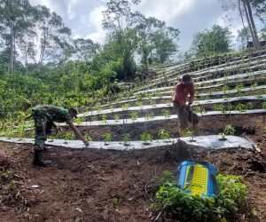 OKU – Bintara Pembina Desa (Babinsa) Koramil 11/Pulau Beringin Serda A. Mujahidin membantu perawatan tanaman cabe di wilayah Desa binaannya di lahan
