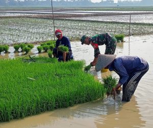 OKU – Personel Koramil 15/Belitang II jajaran Kodim 0403/OKU, Sertu Muhajir Aryanto turut melaksanakan kegiatan mendampingi petani menanam padi di wilayah binaannya,