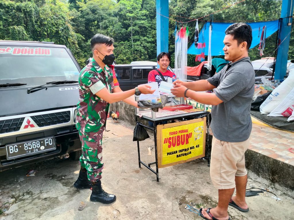 Kodim OKU – Babinsa Negeri Agung Koramil 07/Simpang Kodim 0403/OKU Serda Dira Ariesandi bersama Bhabinkhatibmas gencar memberikan himbauan Prokes dan membagikan masker secara gratis kepada warga masyarakat dan pengunjung serta pedagang pasar guna melindungi warga agar terhindar dari Covid-19 di Desa Negeri Agung, Kecamatan Lengkiti, Kabupaten OKU, Minggu (18/09/2022)