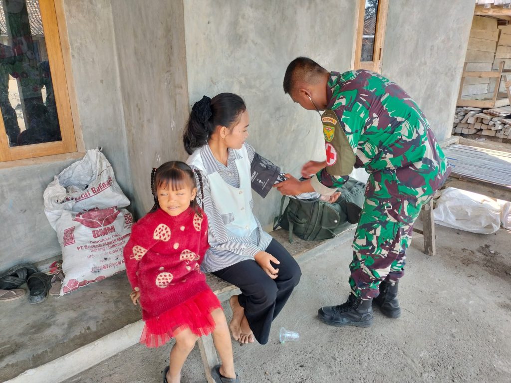 Sertu Wawan, yang tergabung dalam Satgas TMMD, terpantau oleh Tim Penerangan Kodim 0403/OKU tengah memberikan pelayanan pemeriksaan kesehatan secara gratis.