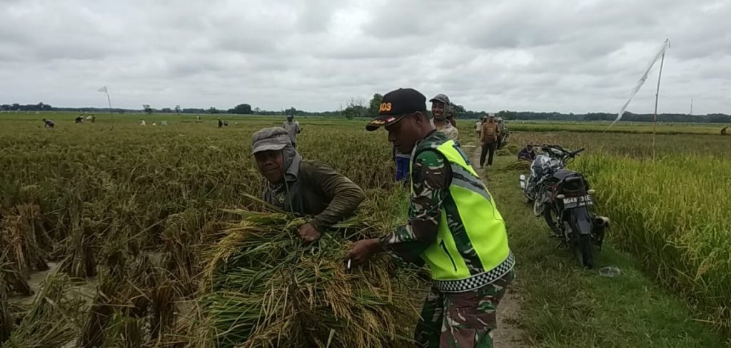 Kodim OKU – Tingkatkan ketahanan pangan dimasa pandemi covid-19, Babinsa Desa Sugih Waras Sertu Rakidi melaksanakan pendampingan panen di kelompok tani Sugih Waras, bertempat di Desa Sugih Waras, Kecamatan Belitang Mulya, Kabupaten OKU Timur, Senin (09/08/2021)