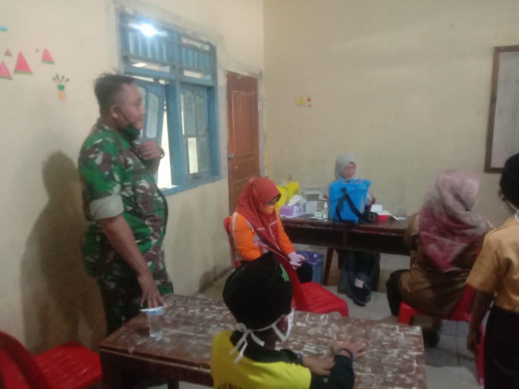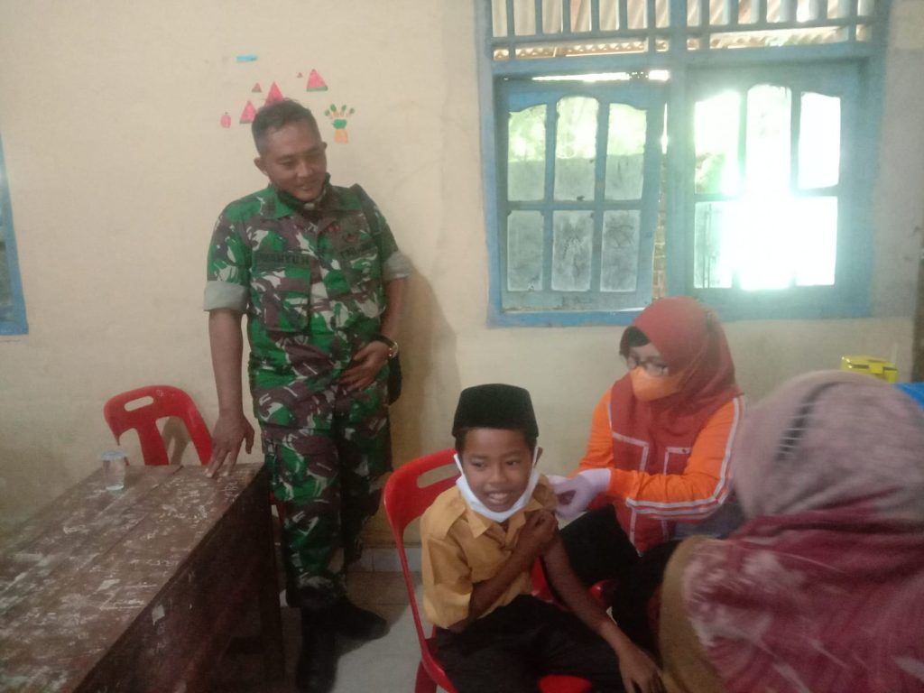 Kodim OKU – Danramil 05/BM Kapten Czi Wahyu Hidayat meninjau langsung kegiatan vaksinasi Dosis 1 di Sekolah MI Nurul Huda Sukaraja Kecamatan Buay Madang, Kabupaten OKU Timur, Sabtu (08/01/2022)