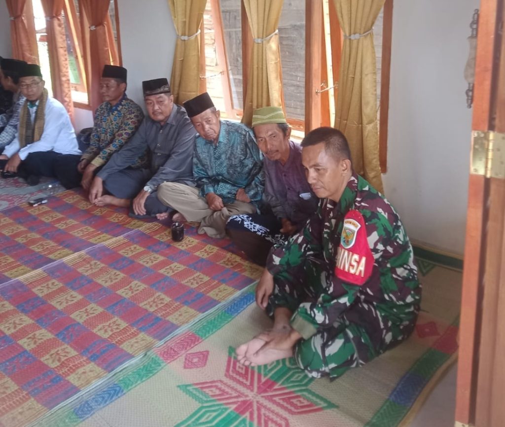 OKU – Babinsa Koramil 06/Cempaka Kodim 0403/OKU Serka Risau menghadiri Kegiatan Tahlilan mengirim Doa di rumah warga Desa Minanga Tengah, Kecamatan Semendawai Barat, Kabupaten OKU Timur, Sabtu (21/06/2025) siang