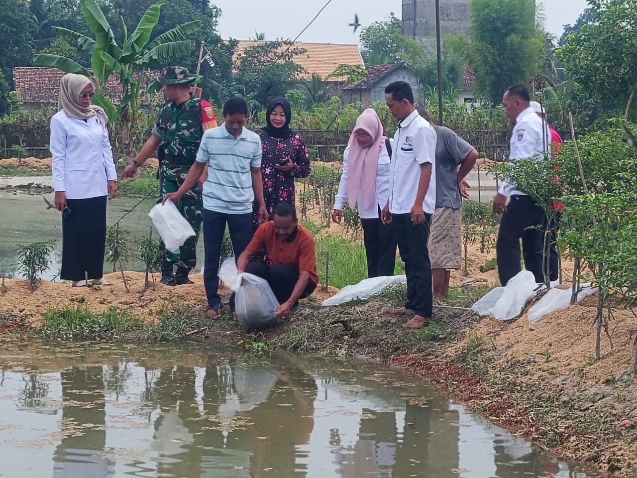OKU Timur – Babinsa Koramil 403-05/Buay Madang Kodim 0403/OKU Serda Sahirin mendampingi Kades dan Ketua BPD Desa Lubuk Harjo. Melaksanakan progaram ketahanan pangan yaitu menebar benih ikan nila di Embung Desa, bertempat di Desa Lubuk Harjo, Kecamatan Belitang Madang Raya, Kabupaten OKU Timur, Jum’at (19/09/2025).