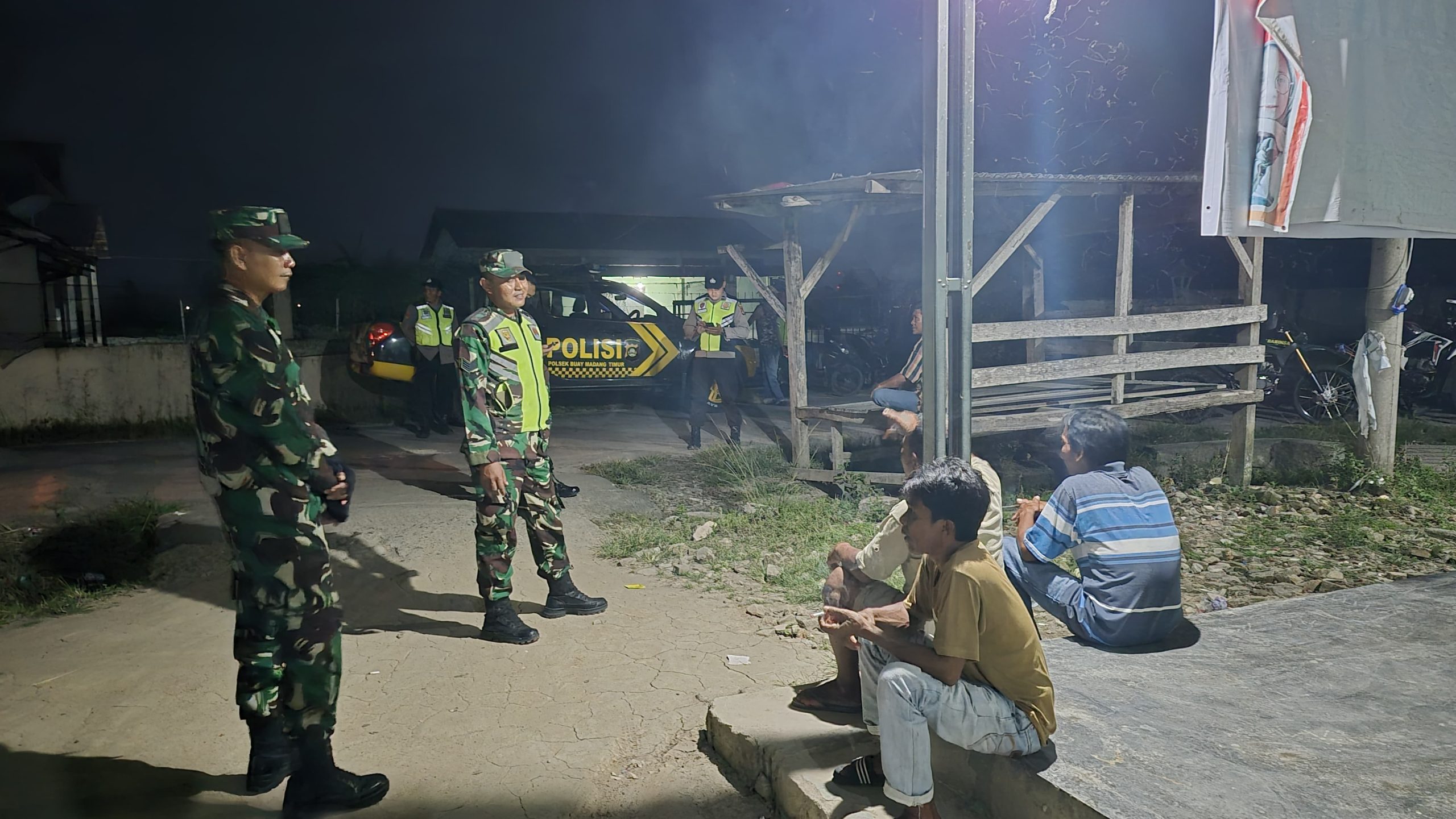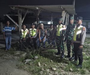 OKU Timur – Babinsa Koramil 403-05/Buay Madang Kodim 0403/OKU, Serma Nanang, Sertu Handoko, Serda Adirin melaksanakan Siskamling dan Patroli bersama Linmas serta masyarakat Desa Sumber Mulyo, Kecamatan Buay Madang Timur, Kabupaten OKU Timur, Senin (15/09/25).