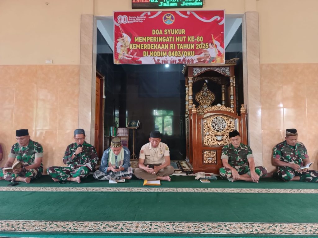 Dengan mengusung tema “Bersatu Berdaulat, Rakyat Sejahtera, Indonesia Maju”, doa syukur dipimpin oleh Kasdim 0403/OKU Mayor Inf Sariyo. Ia mengajak jamaah untuk mensyukuri nikmat kemerdekaan dan mendoakan kelancaran tugas serta pengabdian prajurit TNI kepada bangsa.