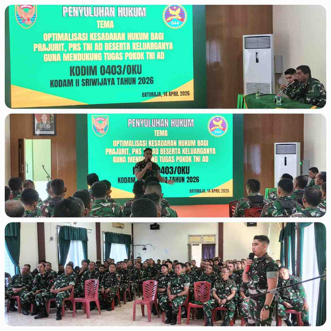 OKU – Prajurit dan PNS Kodim 0403/OKU menerima penyuluhan hukum dan pembinaan mental dari Tim Kumdam II/Swj, dengan maksud membangun sikap mental dan perilaku para prajurit yang taat hukum, serta untuk mengoptimalisasikan penegakkan hukum dalam kehidupan prajurit. Kegiatan berlangsung di Aula Yudha Makodim, Jl. A. Yani KM 6 Kemelak Bindung Langit, Kecamatan Baturaja Timur, Kabupaten OKU, Senin (13/04/2026).