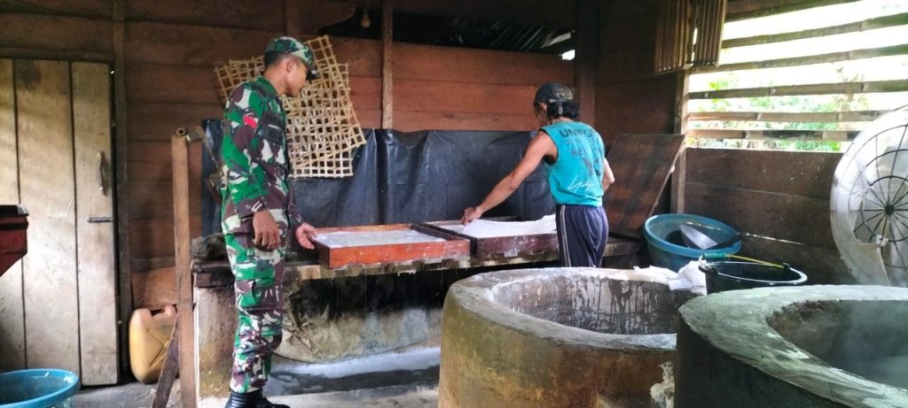 OKU – Dalam rangka melaksanakan kegiatan Komunikasi Sosial atau Komsos dan juga sebagai bentuk dukungan pada produk UMKM masyarakat. Babinsa Koramil 11/Pulau Beringin, Kodim 0403/OKU Praka Puji Susilo tak segan untuk turun membantu warga binaan.