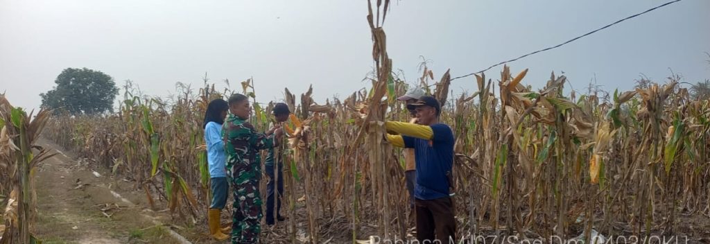 OKU – Bintara Pembina Desa (Babinsa) Koramil 07/Simpang Kodim 0403/OKU Sertu Suprayogi membantu melaksanakan panen jagung di lahan milik warga Desa Tunas Jaya, Kecamatan Buana Pemaca, Kabupaten OKU Selatan, Senin (18/08/2025).